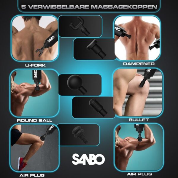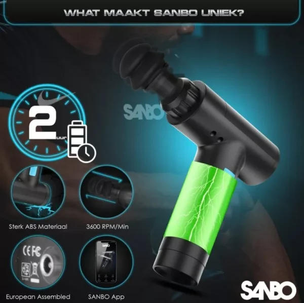 De SANBO Massage Gun is het nieuwste apparaat op het gebied van klopmassage en vibratiemassage. De massage gun wordt aanbevolen door fysiotherapeuten in heel Nederland voor gerichte spierbehandelingen. Het apparaat behandelt diverse spiergroepen in het lichaam en zorgt voor een goede stimulatie van de bloedsomloop naar de spieren.
