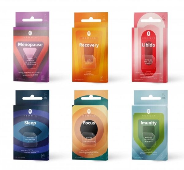De functionele patches van Hemnia zijn transdermale pleisters met natuurlijke ingrediënten die je lichaam geleidelijk op een veilige manier ondersteunen. Verkrijgbaar in zes varianten – Immunity, Focus, Libido, Recovery, Menopause en Sleep – voor elk moment van de dag. Discreet, gemakkelijk in gebruik en zonder belasting van je spijsvertering. Plak, draag, voel het verschil.